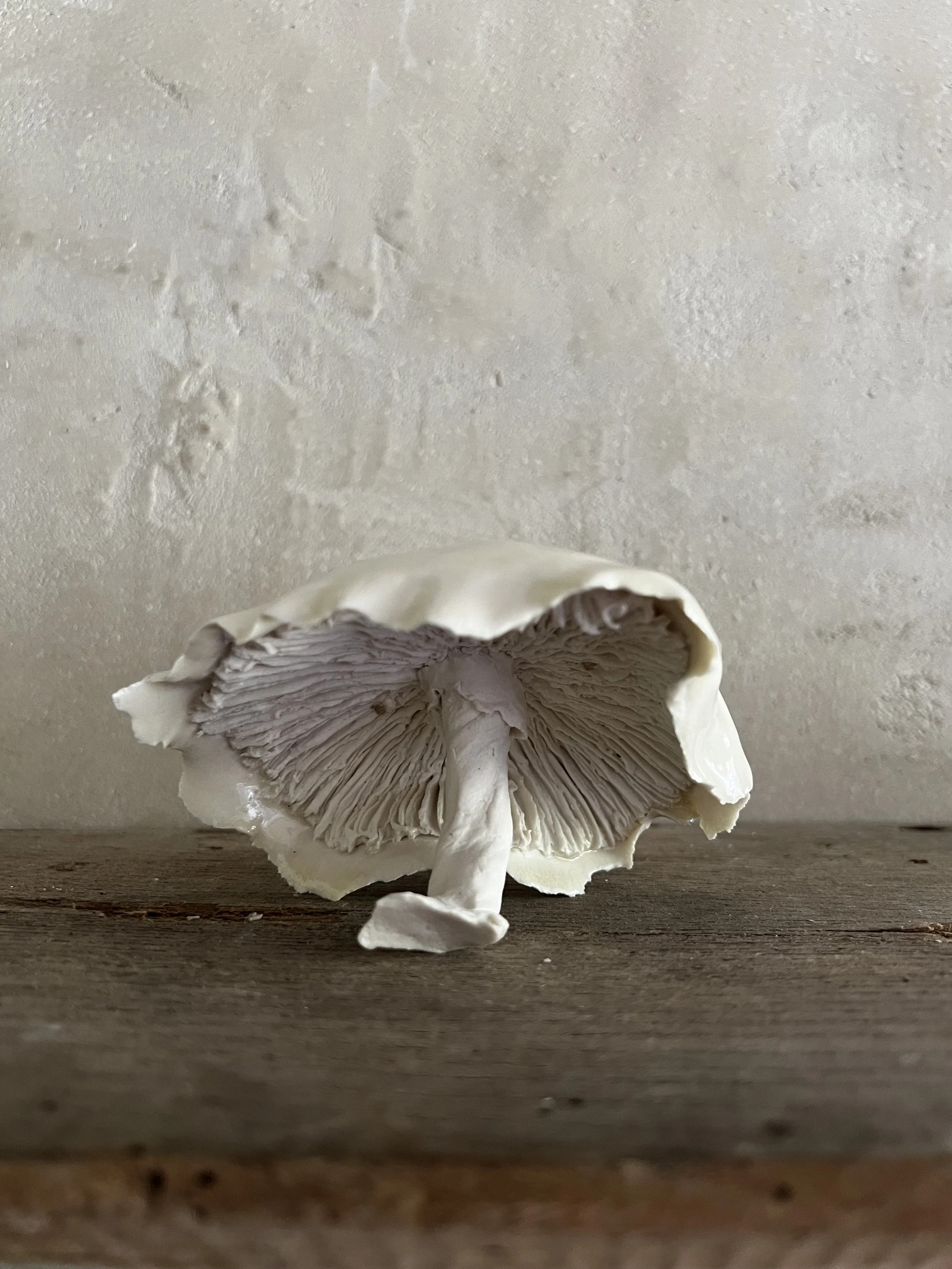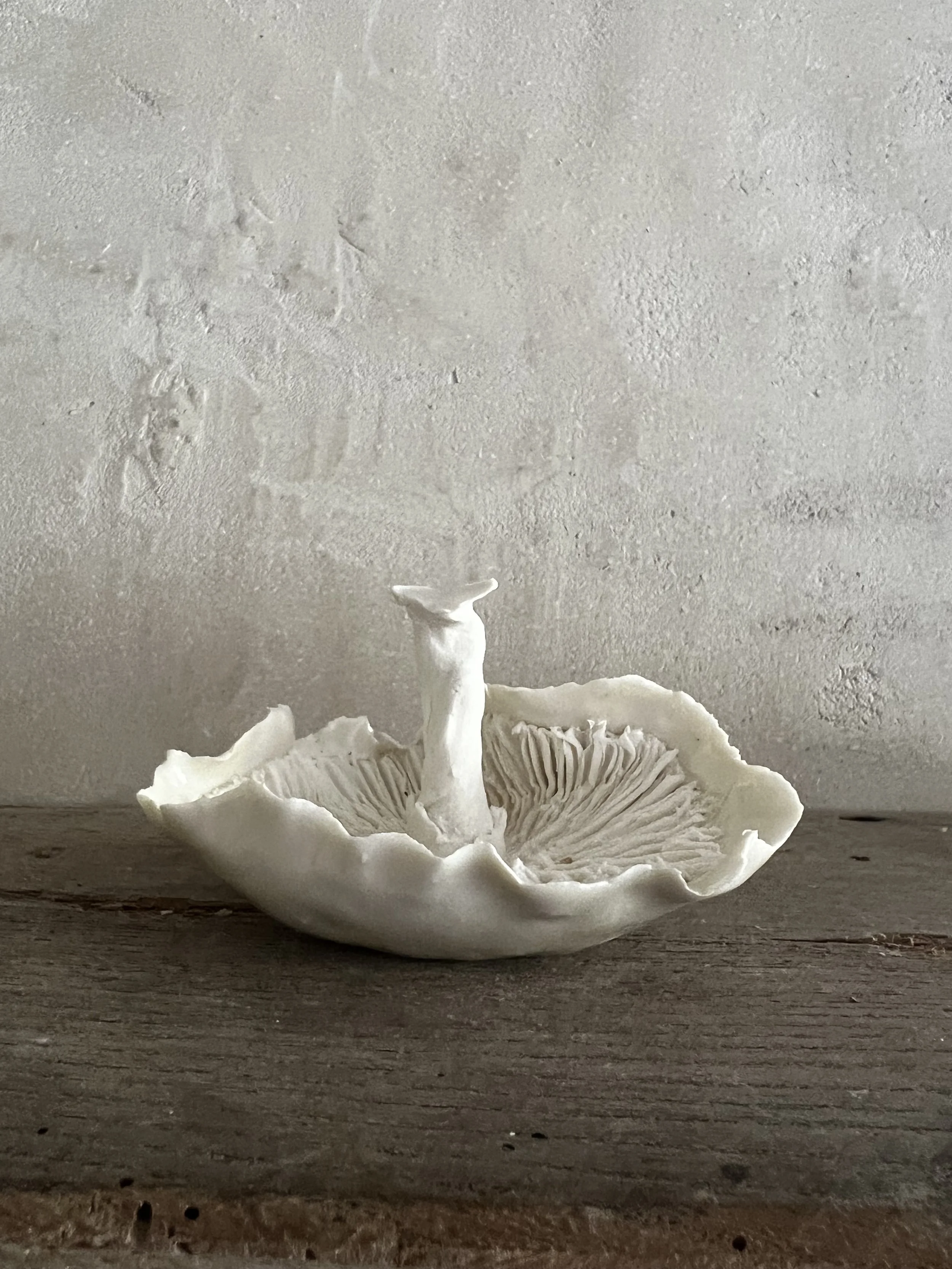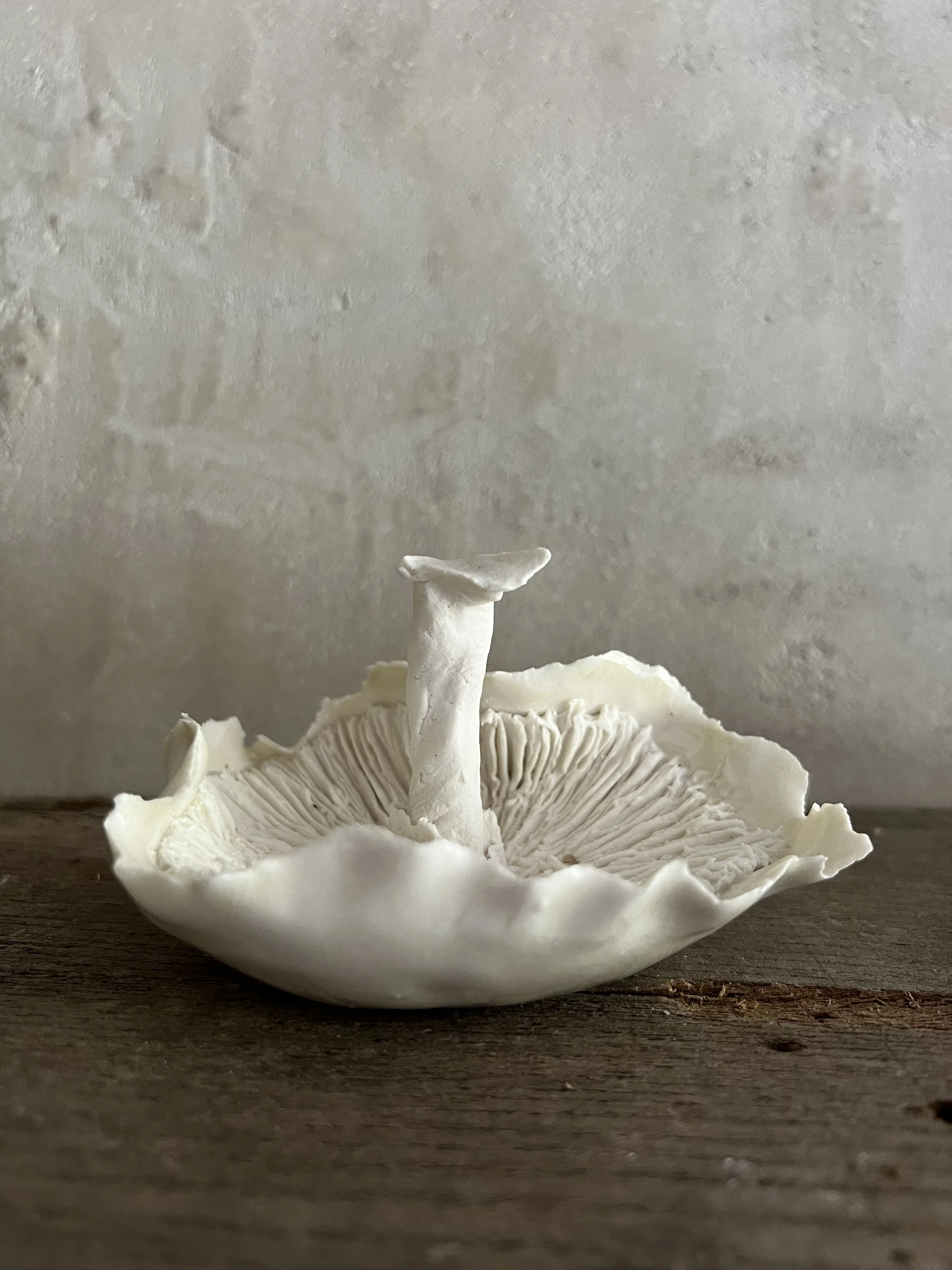 I have one in stock. If made to order there will be a lead time of 2 weeks. These mushrooms are made with a combination of black clay, porcelain and a textured glaze. They are very temperamental to make as the clays shrink at different rates which means there is a high failure rate with exploding mushrooms in the kiln but I persist as I think they are worth the effort! They are wonderfully dramatic and slightly bigger than most of the other mushrooms. I have used one of these upturned mushrooms as a jewellery holder on my bedside table as the gills hold small items in place!