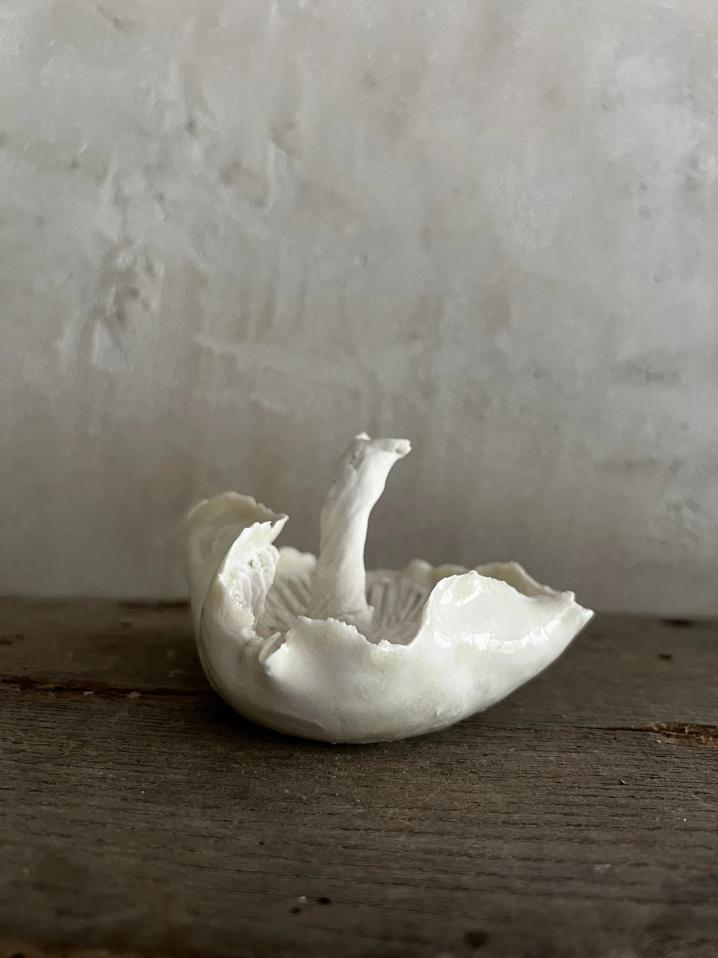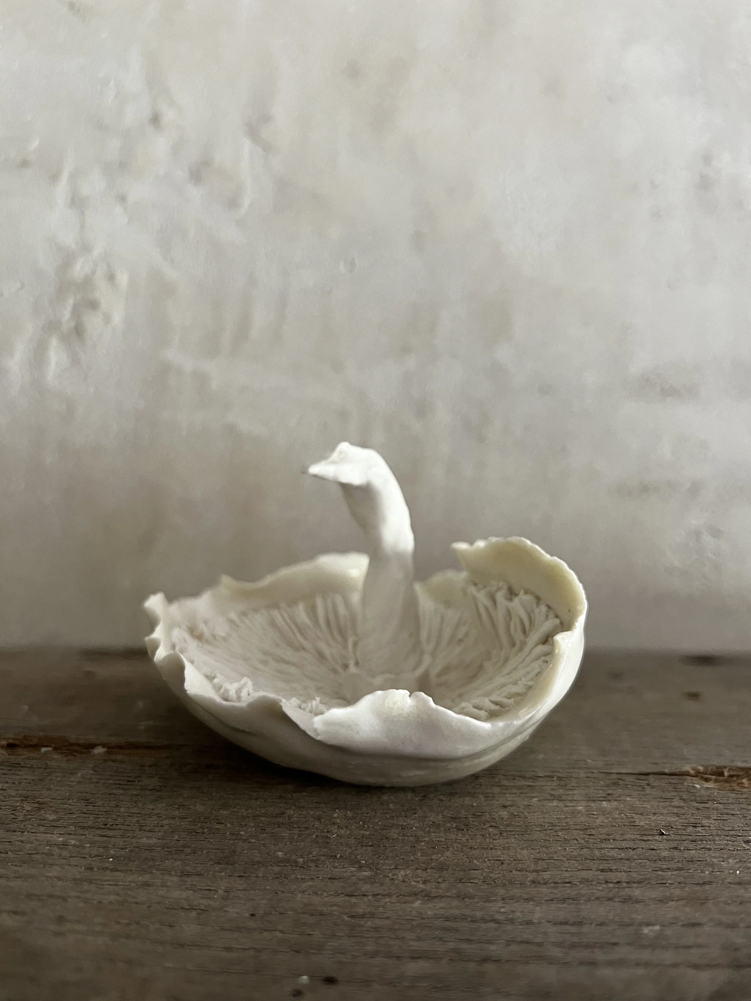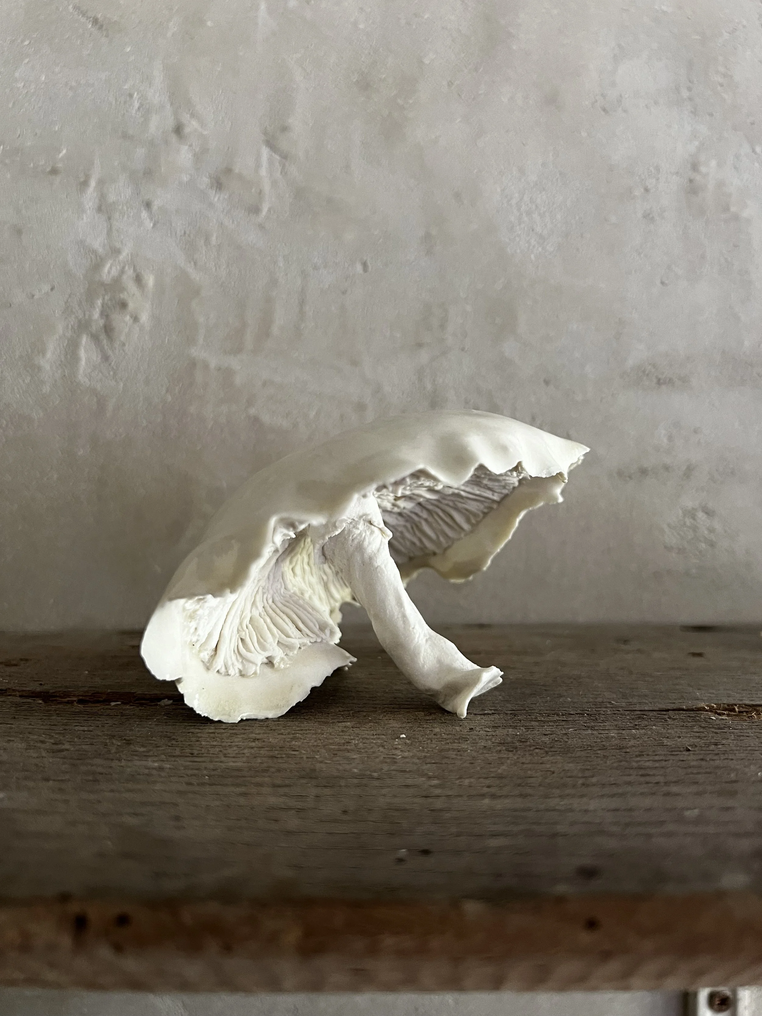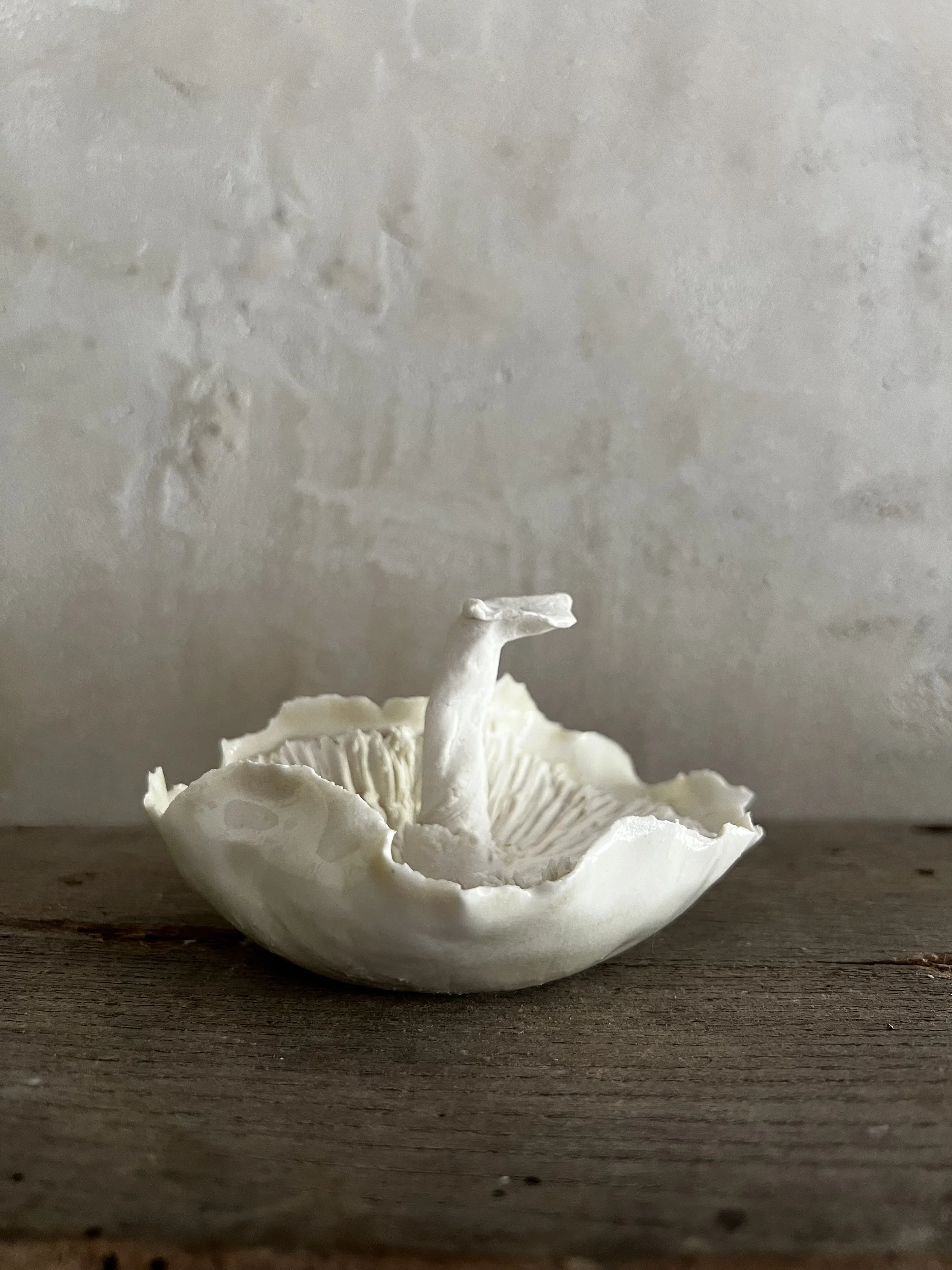 I have one in stock. If made to order there will be a lead time of 2 weeks. These mushrooms are made with a combination of black clay, porcelain and a textured glaze. They are very temperamental to make as the clays shrink at different rates which means there is a high failure rate with exploding mushrooms in the kiln but I persist as I think they are worth the effort! They are wonderfully dramatic and slightly bigger than most of the other mushrooms. I have used one of these upturned mushrooms as a jewellery holder on my bedside table as the gills hold small items in place!