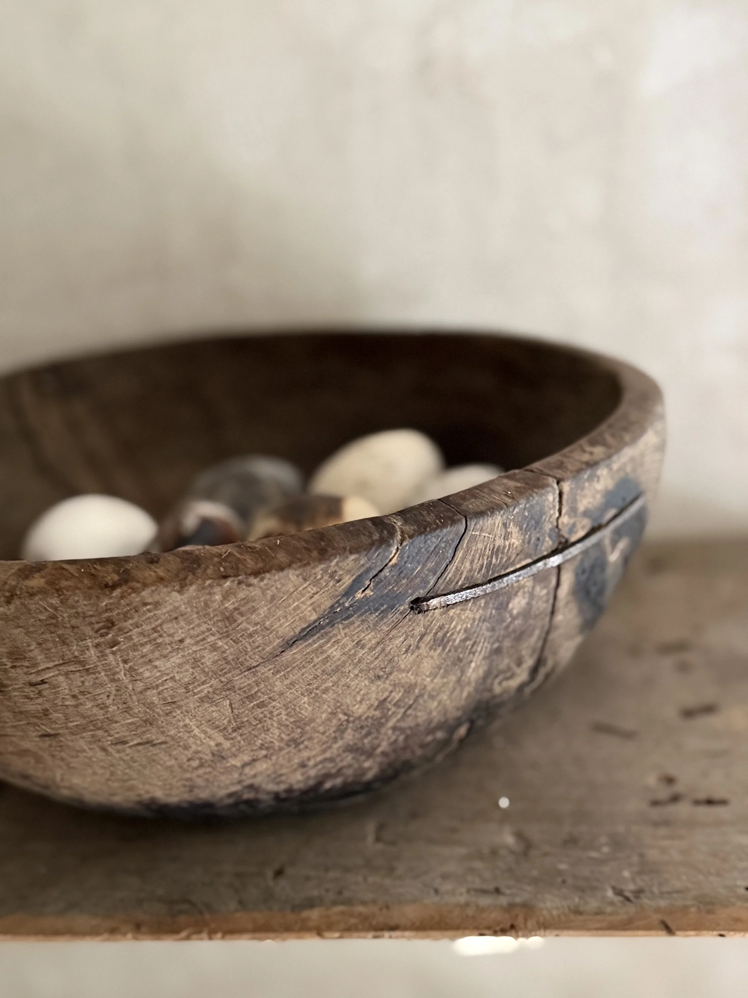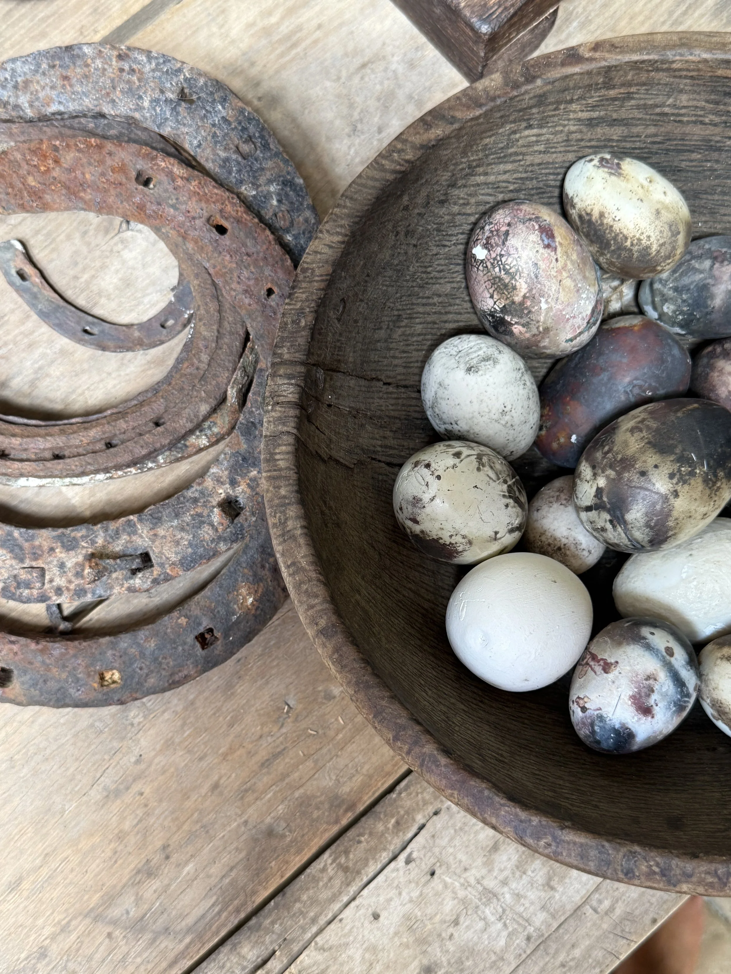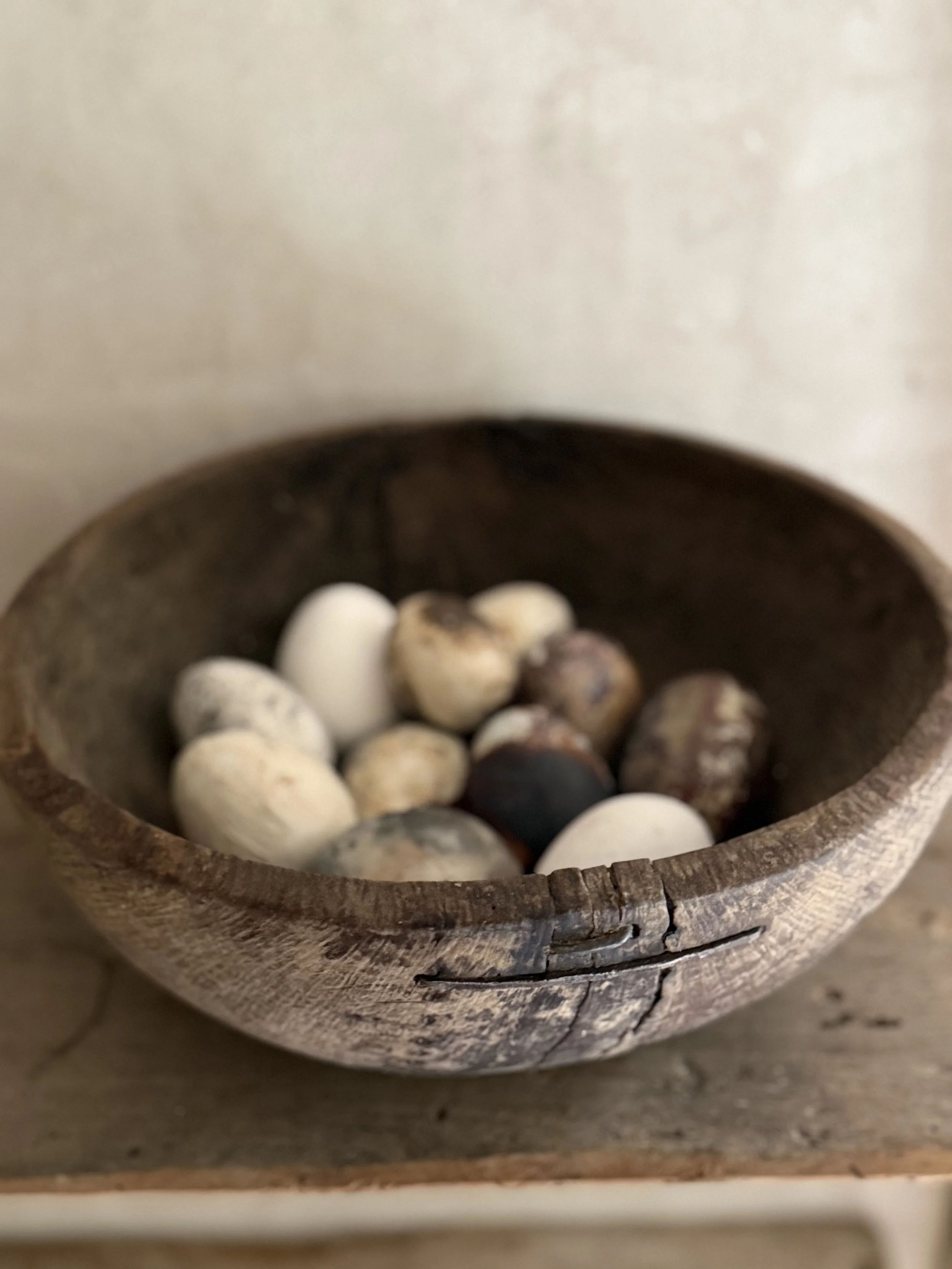 The bowl alone is a show stopper. I find it increasingly hard to find beautiful antique bowls and when they are stapled together with age, I love them even more. I’ve filled this heavy hardwood bowl with 11 saggar fired eggs. These have been through the kiln in an airtight container with combustible materials such as straw, hay, banana skins, coffee grains and other natural finds to create one off results in the firing.