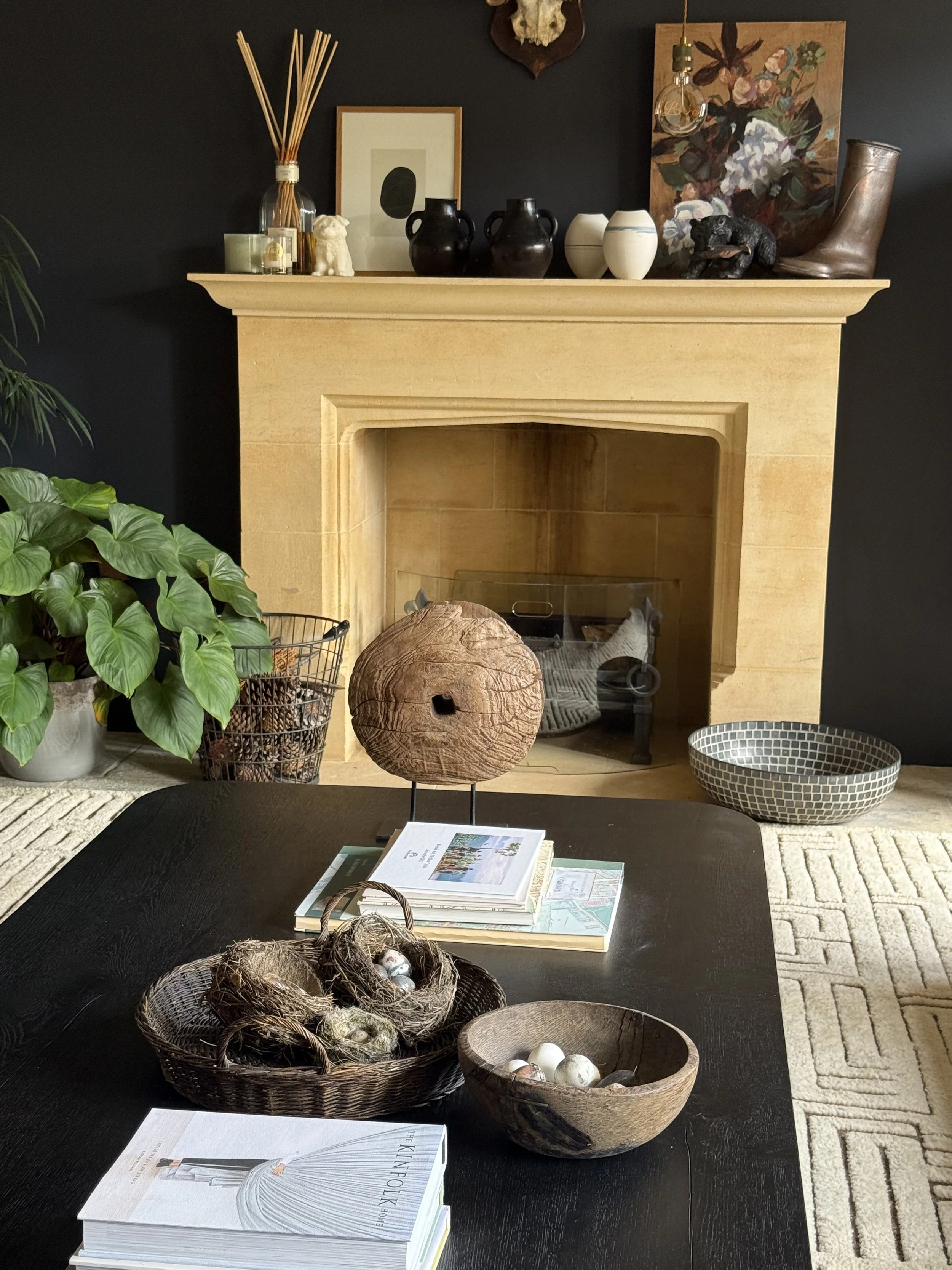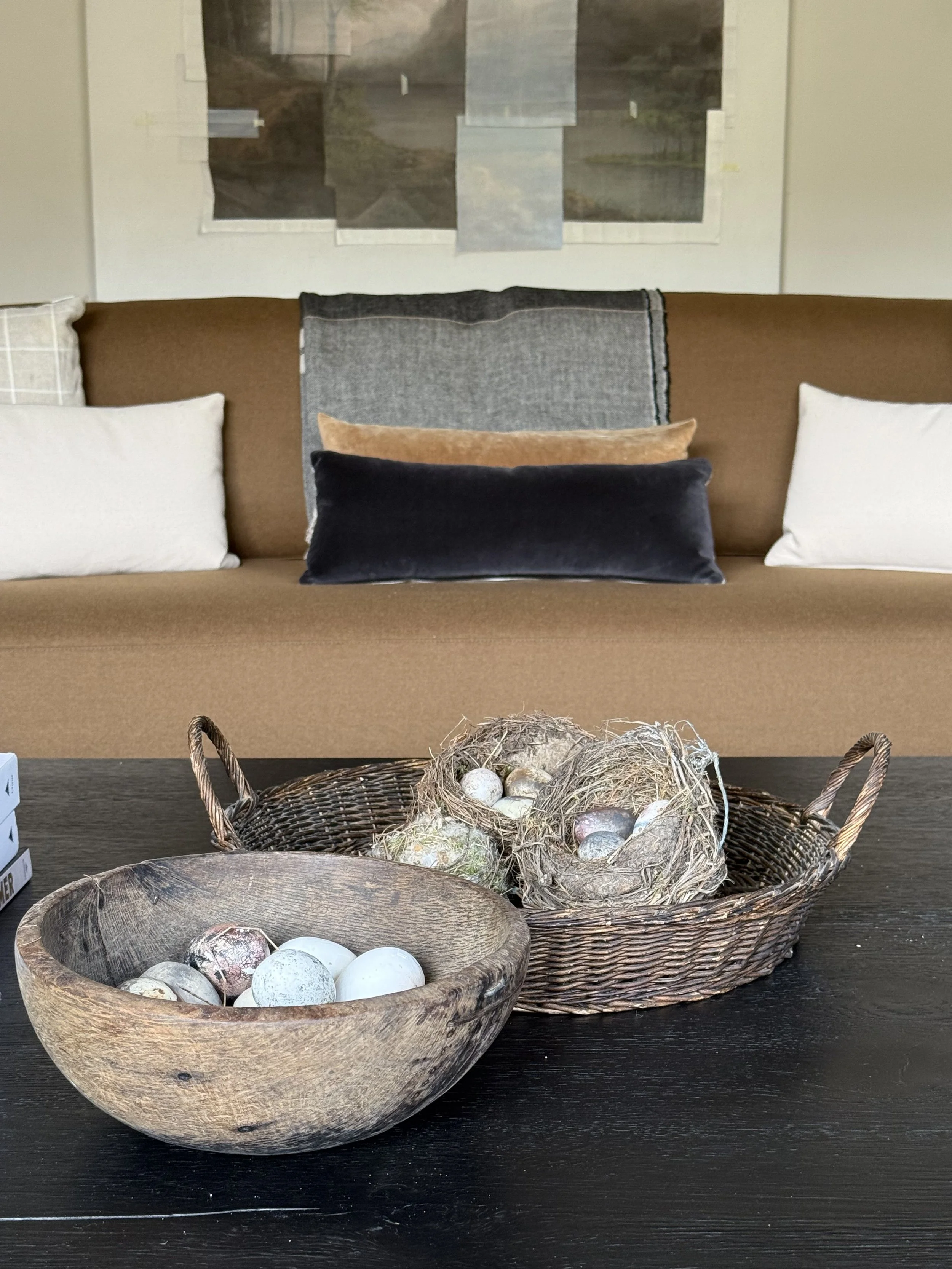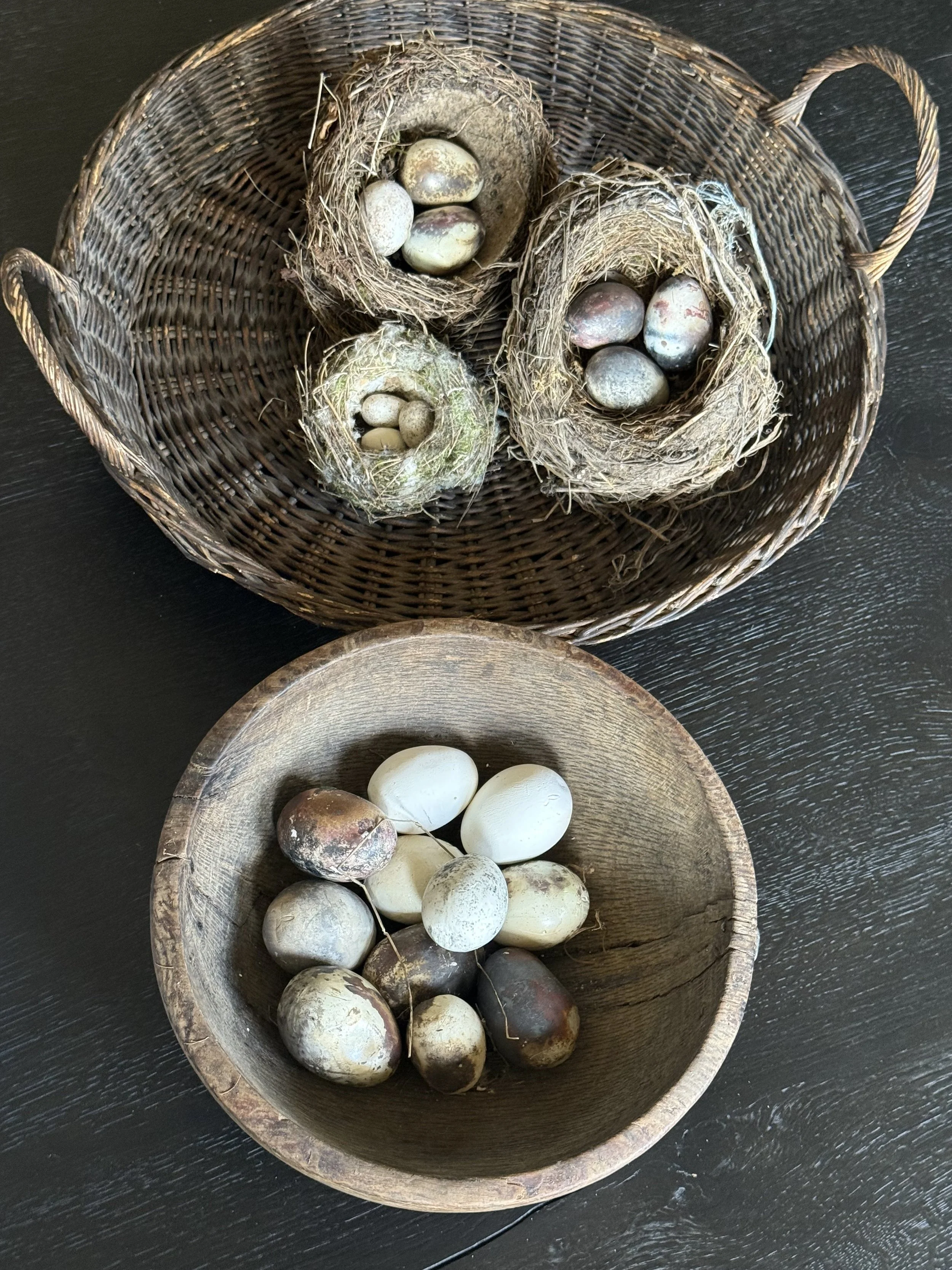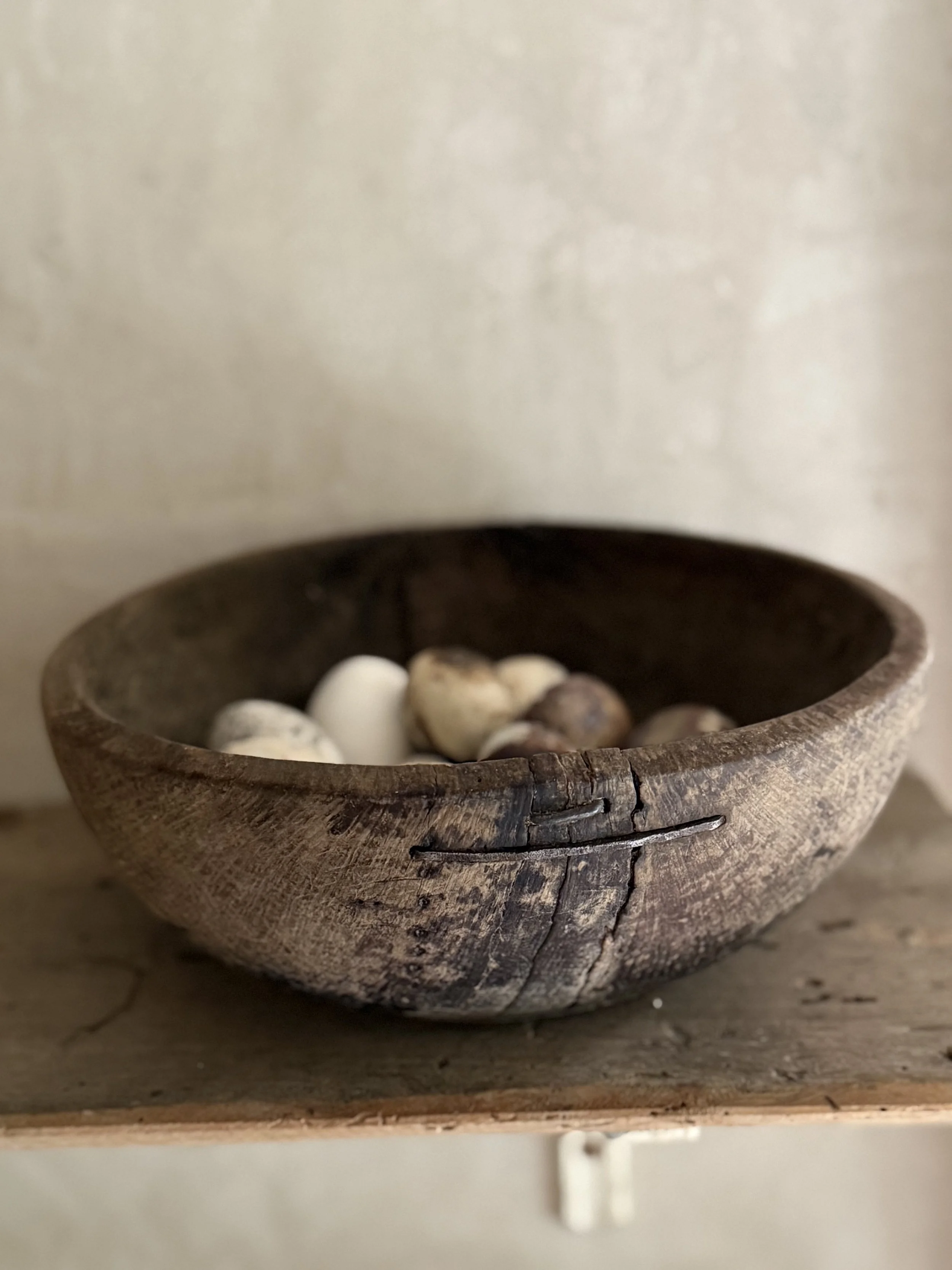 The bowl alone is a show stopper. I find it increasingly hard to find beautiful antique bowls and when they are stapled together with age, I love them even more. I’ve filled this heavy hardwood bowl with 11 saggar fired eggs. These have been through the kiln in an airtight container with combustible materials such as straw, hay, banana skins, coffee grains and other natural finds to create one off results in the firing.