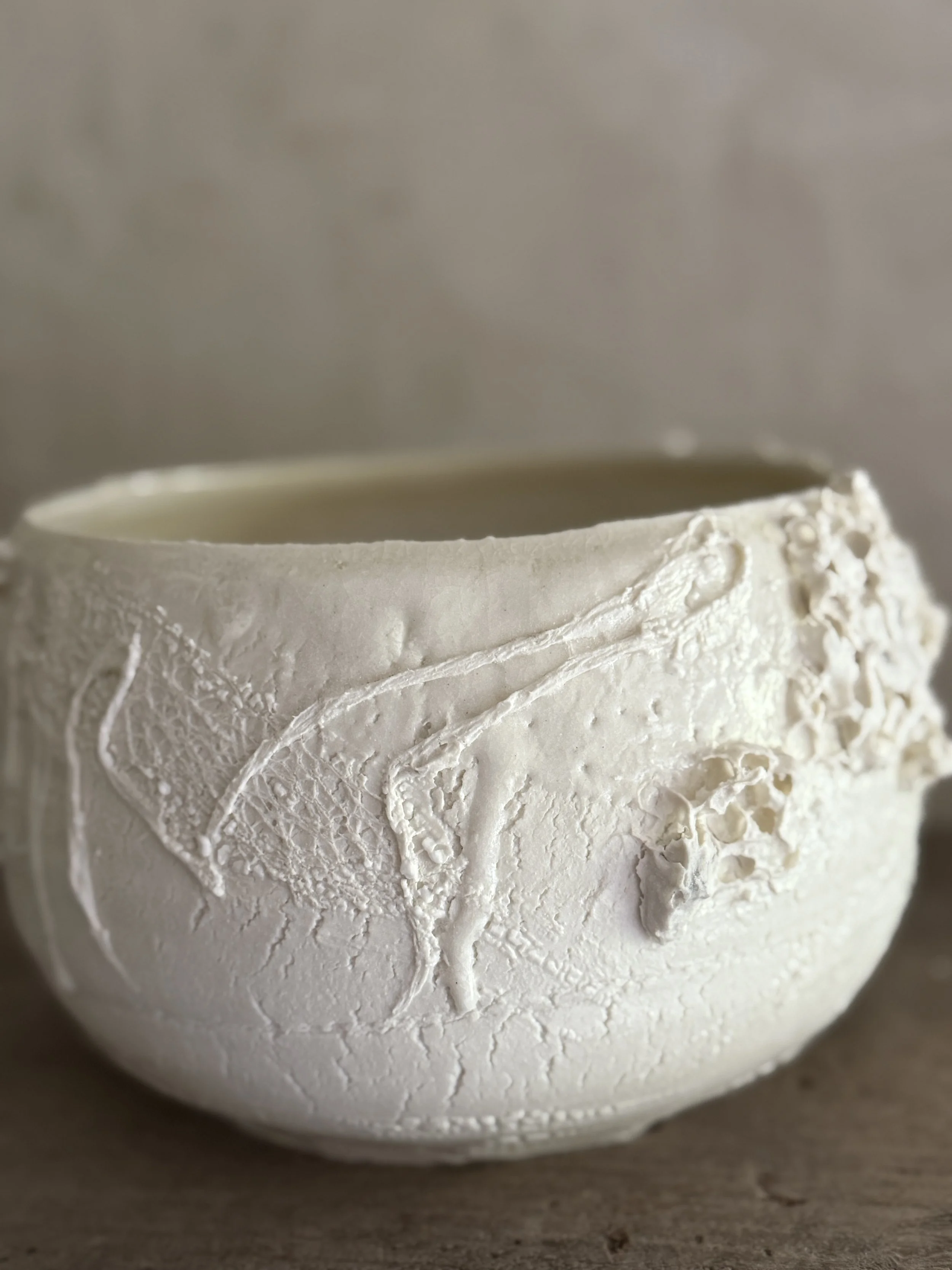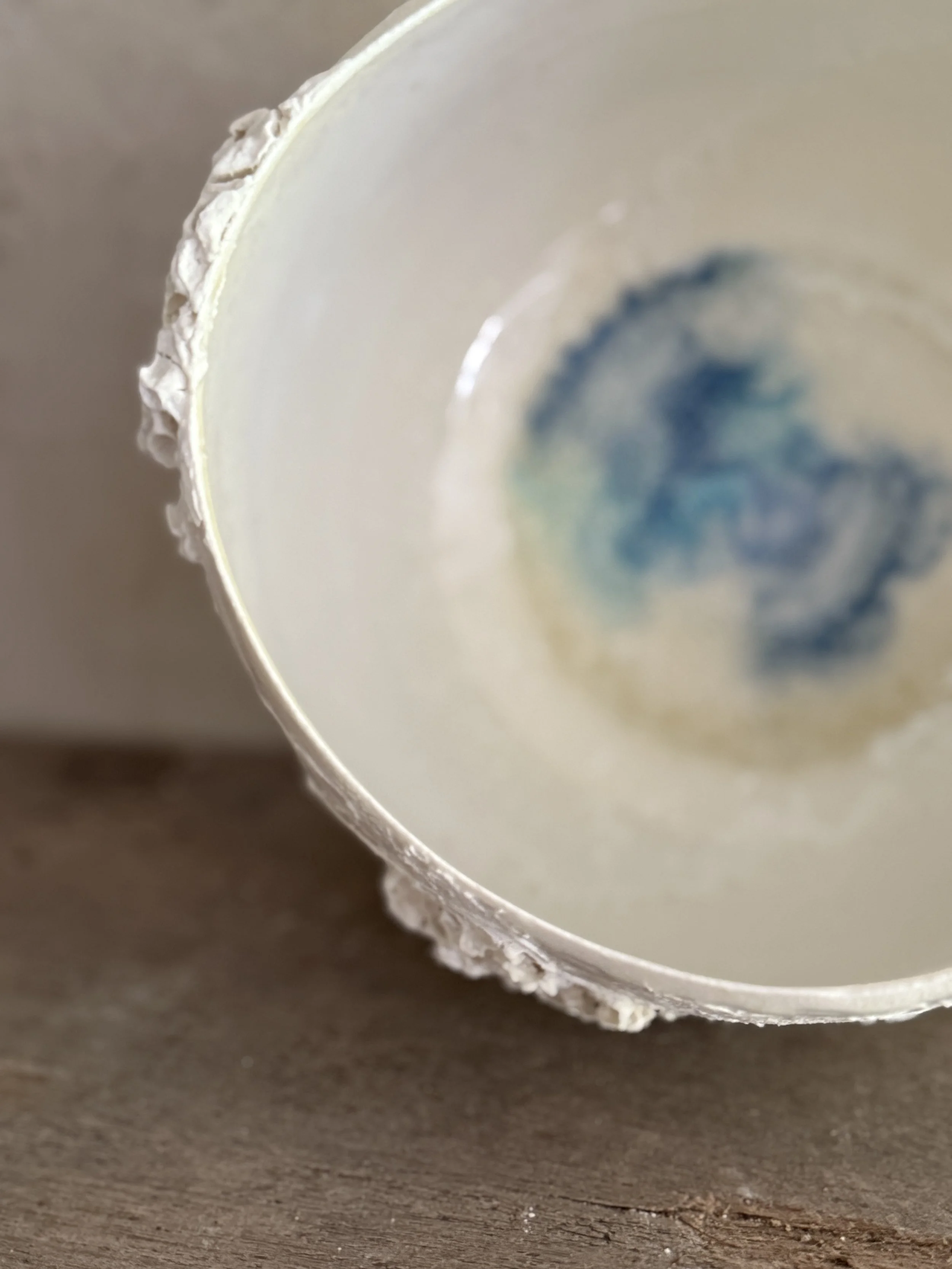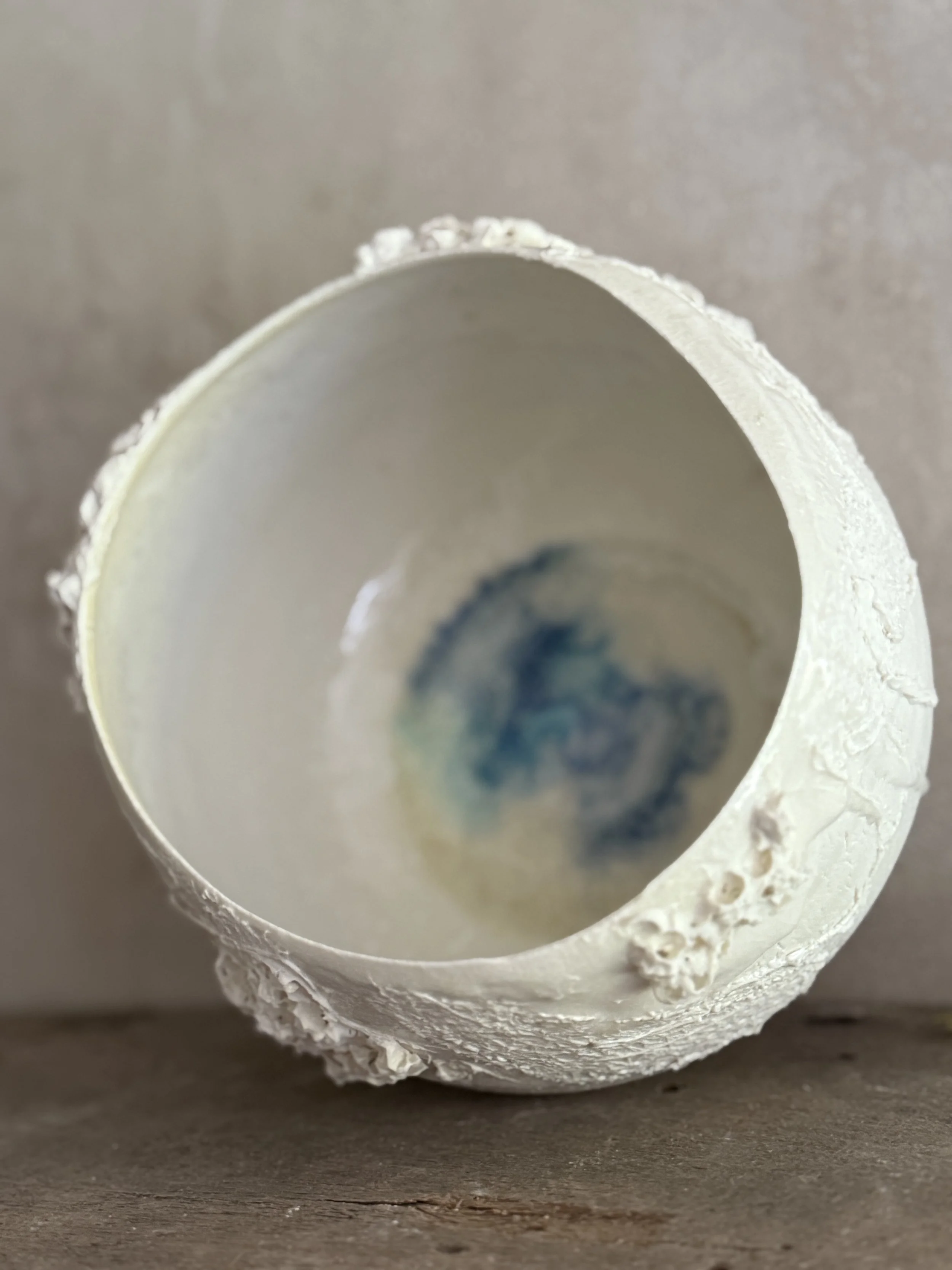 Thrown on the wheel in white clay this bowl was then altered in shape and the process of adding the frogspawn took place. Textiles are also used to create the effect of strands of vegetation. Inside the base has blue glass to represent clear water. This style of vessel was inspired by the vast number of tadpoles in the pond in our garden - there have been tadpoles in there for months… they must keep on multiplying! I have left the outside unglazed for a raw feel. Inside the bowl is smooth and glazed and could be used as a vase or maybe add water and a floating candle to continue the watery feel?