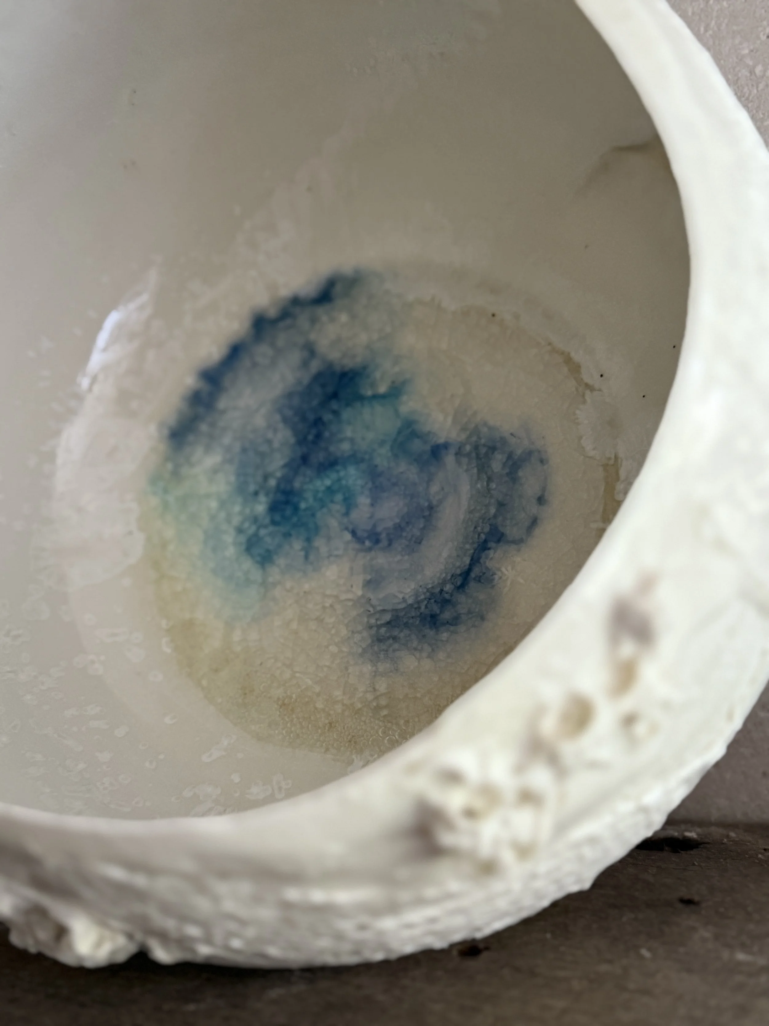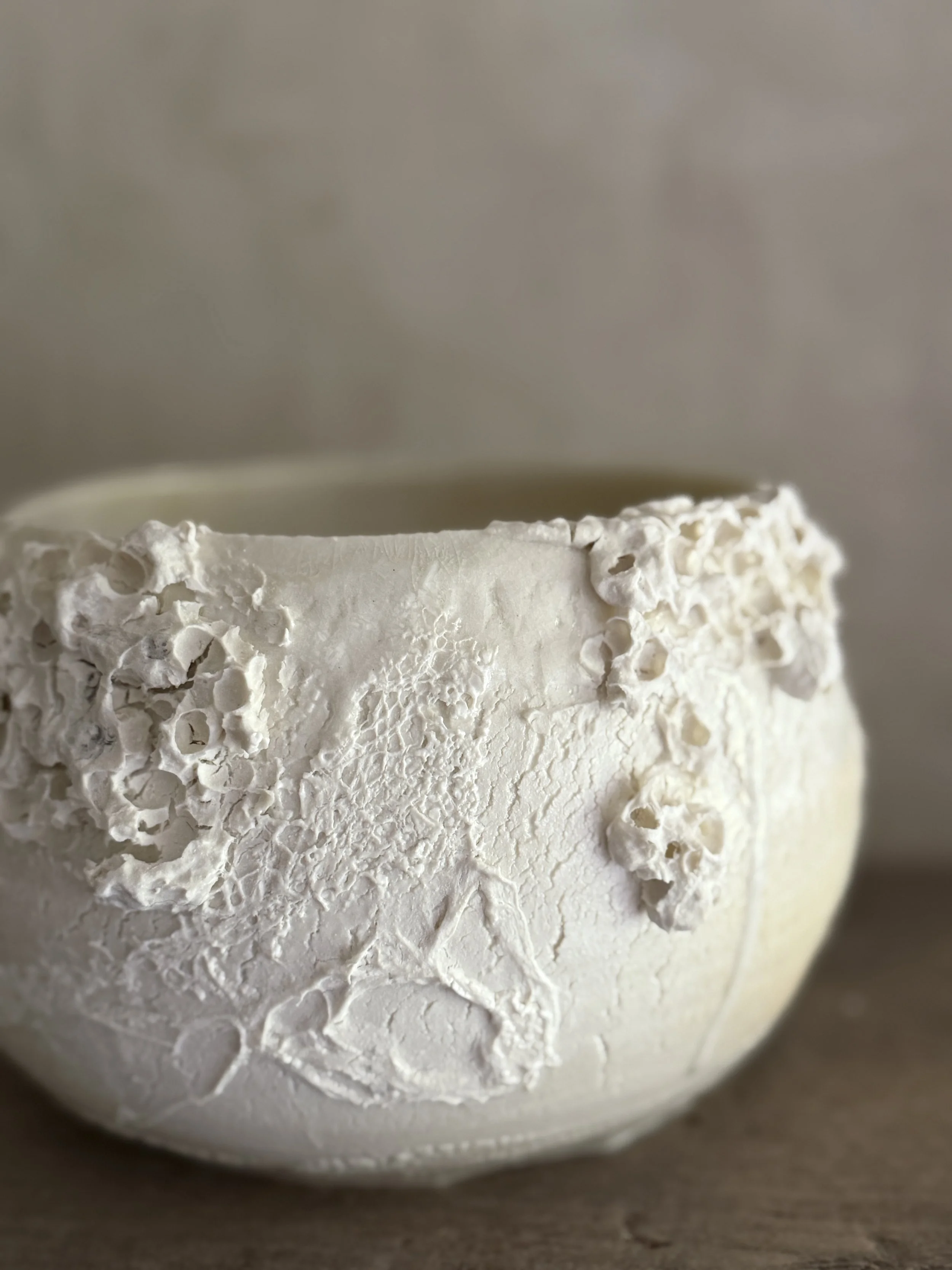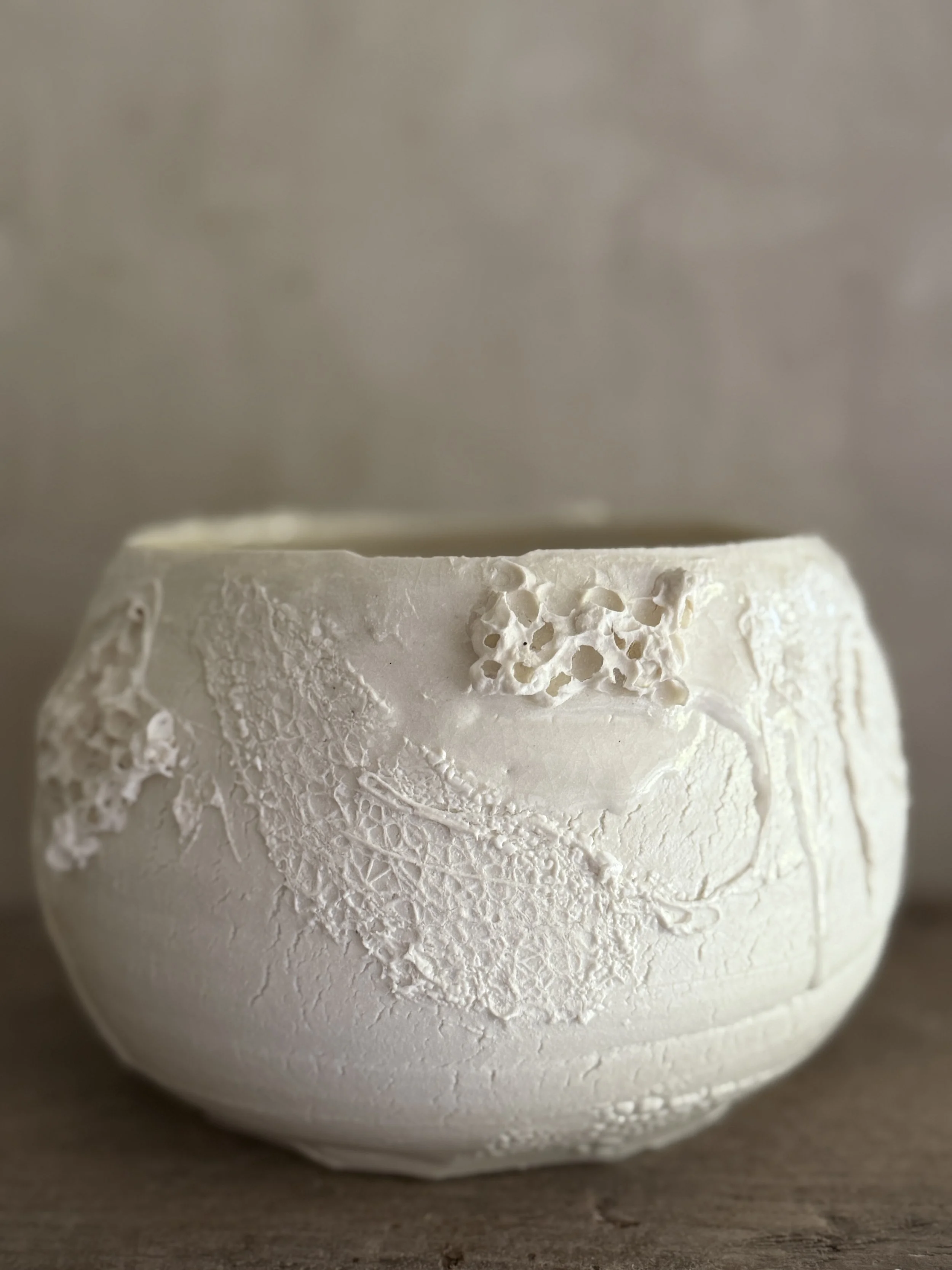 Thrown on the wheel in white clay this bowl was then altered in shape and the process of adding the frogspawn took place. Textiles are also used to create the effect of strands of vegetation. Inside the base has blue glass to represent clear water. This style of vessel was inspired by the vast number of tadpoles in the pond in our garden - there have been tadpoles in there for months… they must keep on multiplying! I have left the outside unglazed for a raw feel. Inside the bowl is smooth and glazed and could be used as a vase or maybe add water and a floating candle to continue the watery feel?