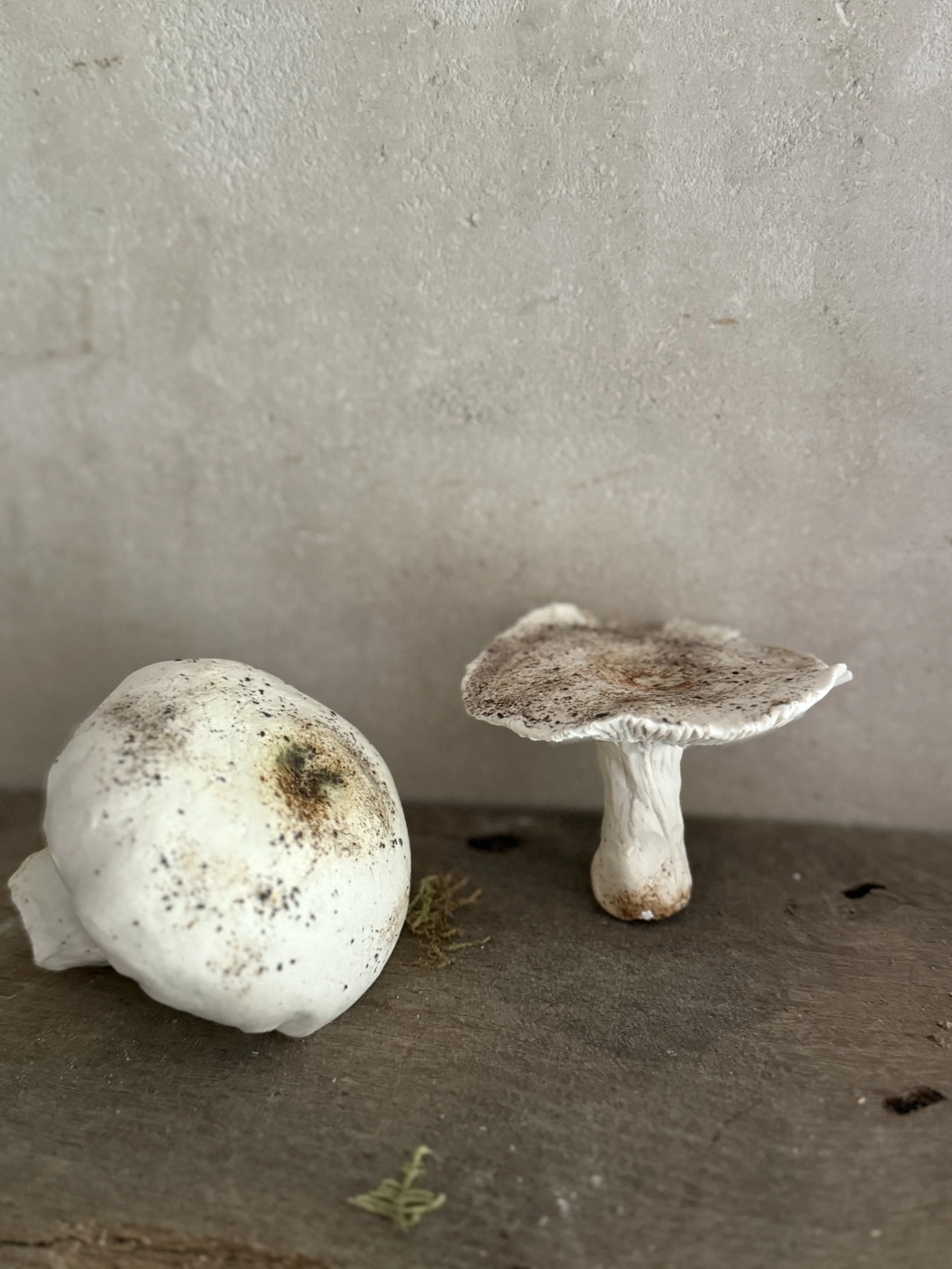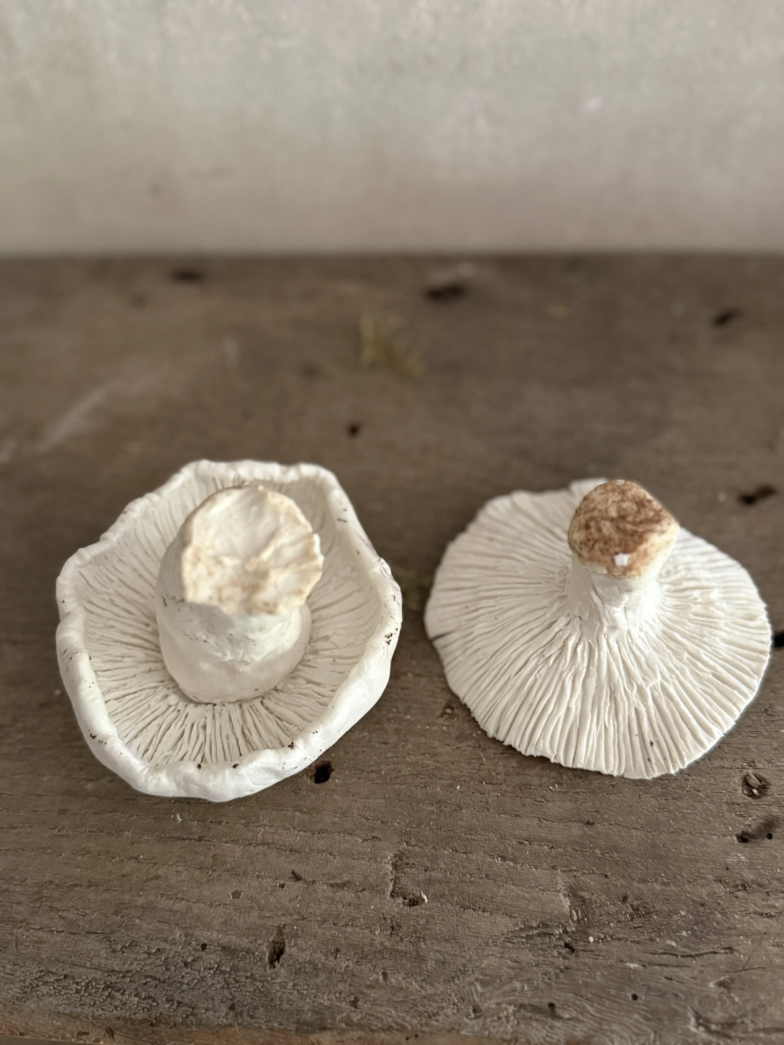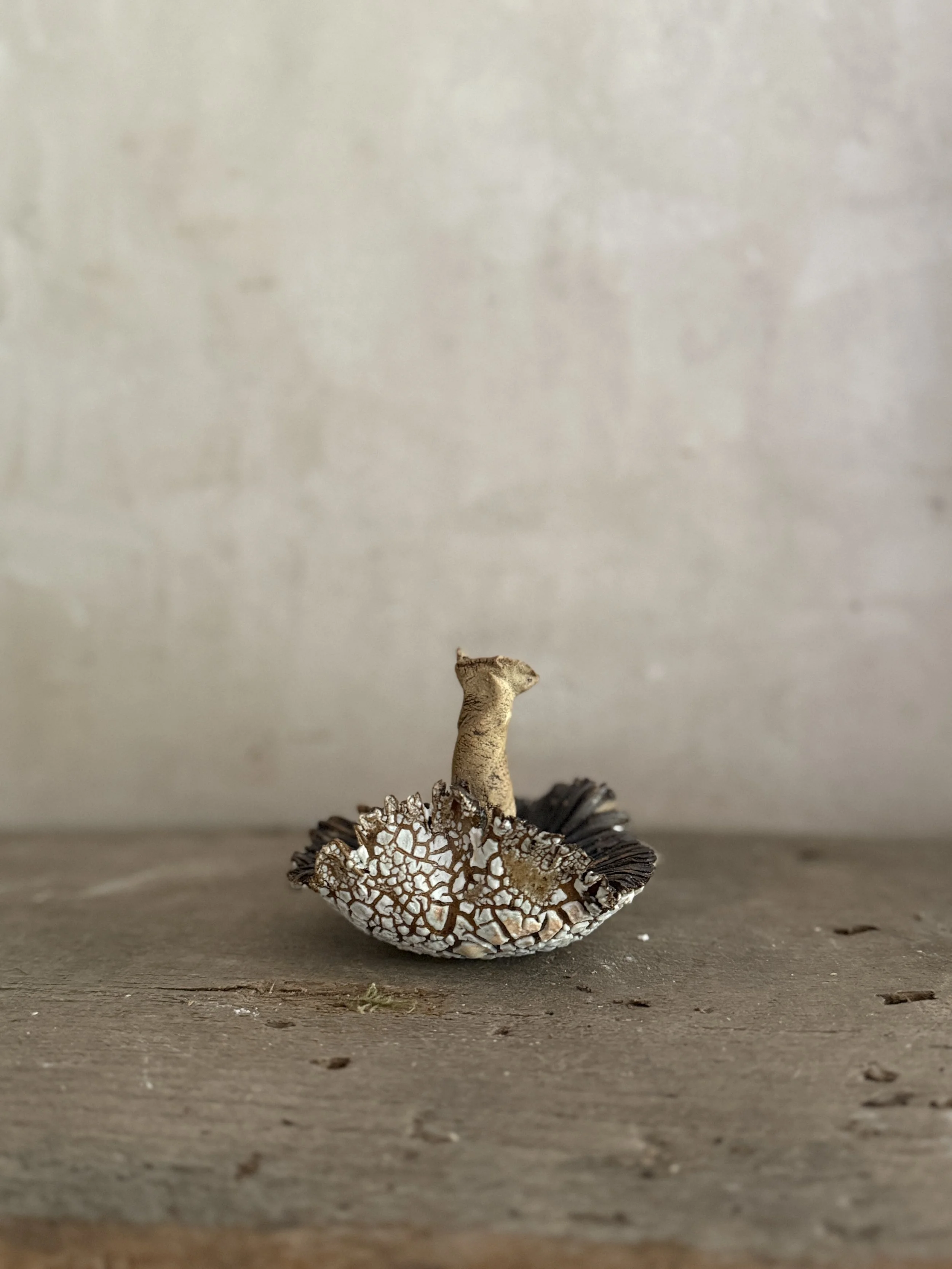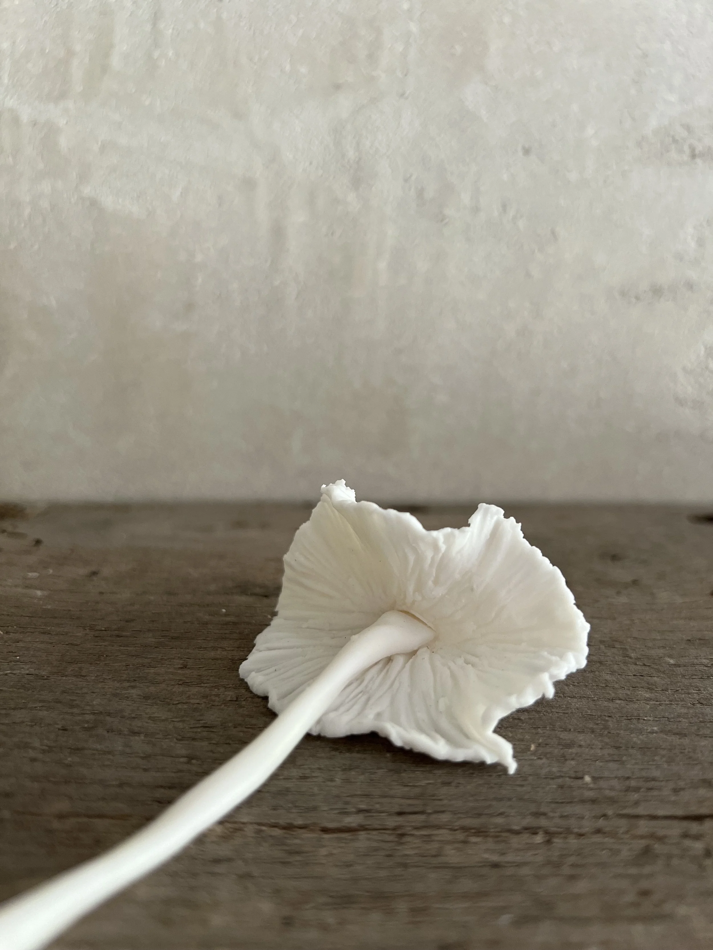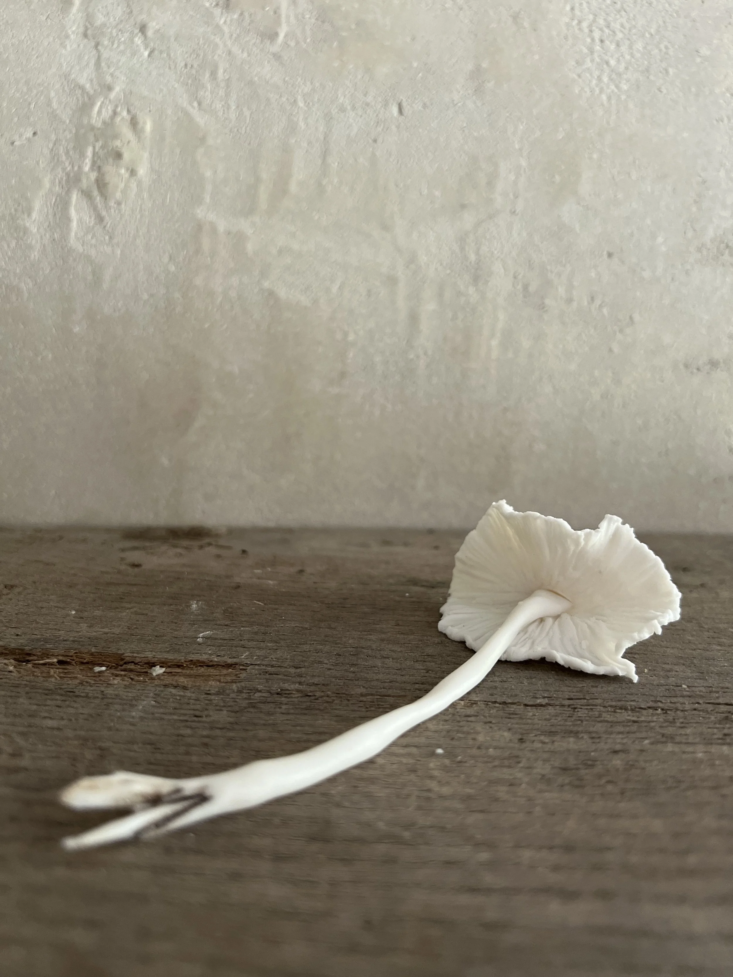 These mushrooms are made from porcelain to mirror their beautiful colour in nature. They are related to the Shaggy Inkcap mushrooms but remain white and pure. I have one in stock but can make to order.